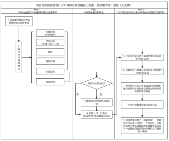 1. 前置条件:各二级单位实验室内目前在用、且已取得《特种设备使用登记证》的压力容器、锅炉、起重机械、压力管道等在实验室范围内使用的特种设备,因实际需要发生停用、启用、跨市/区迁移、延长使用年限和报废注销等情况。其中,涉及特种设备报废注销的,需要先完成中山大学固定资产的报废处置工作,取得资产回收单位出具的《特种设备破拆证明》。实验室应保存好《特种设备使用登记证》原件及特种设备出厂资料、整机检验报告和安全附件检验检测证书等全套安全技术档案。