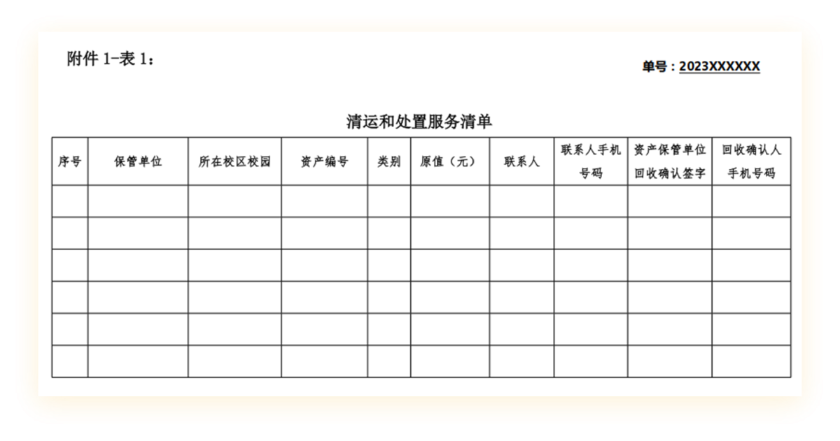 1.设备处向服务公司发送清运任务。设备处收到校长办公会处置决议后,一周内向第三方服务公司整理发送《清运任务通知单》和《清运和处置服务清单》。